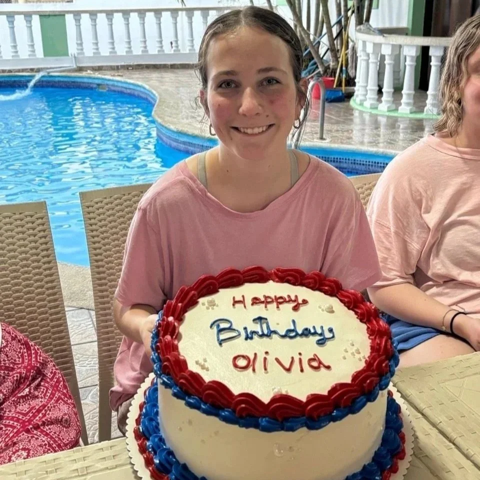 Dinner tonight was pasta and plantains. After dinner we had a mini surprise party to celebrate Olivia’s 17th birthday, with a delicious cake baked especially for Olivia by a local! We’ve been treated to fresh avocados at every meal. Following dinner several of our team members took a dip in the pool at our guest house and some played cards and hungout! We had a night of sharing our highs and lows of the night with creative endeavors like charades and artwork! Our team is tired after a busy day and ready to rest our heads on our comfy pillows!